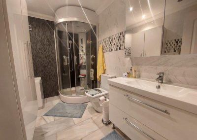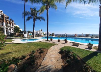 Construido con materiales de alta calidad, mármol, ventanas renovadas de doble acristalamiento y puertas de patio imitación madera, aire acondicionado con bomba de calor en el salón, chimenea, armarios empotrados y está a un paso de una de las piscinas.