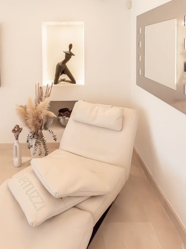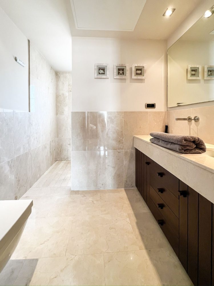 The kitchen is equipped with premium appliances, including two Smeg ovens, an american-style fridge/freezer, a “Quooker” boiling water tap, and electrically operated self-opening drawers. A central island, LED lighting, and panoramic glass doors complete this stylish space, seamlessly connecting the interior to the west-facing terrace, lush gardens, and an infinity pool.