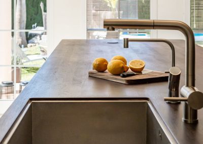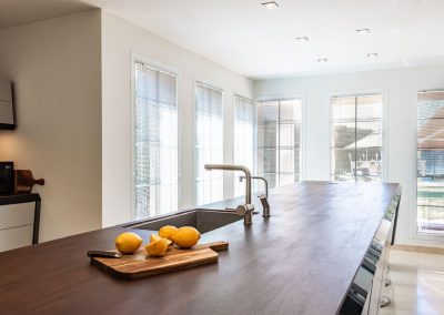 The kitchen is equipped with premium appliances, including two Smeg ovens, an american-style fridge/freezer, a “Quooker” boiling water tap, and electrically operated self-opening drawers. A central island, LED lighting, and panoramic glass doors complete this stylish space, seamlessly connecting the interior to the west-facing terrace, lush gardens, and an infinity pool.